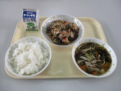 今日のメニューは、なすと豚肉のみそ炒め、もずくスープ、白ご飯、牛乳です。