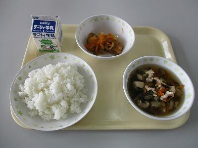 今日のメニューは、からあげ、茎わかめのきんぴら、里芋のみそ汁、白ご飯、牛乳です。今日は運動会の全体練習1回目があり、さわやかな「はいっ!」という返事が菓子野の原に響き渡りました。からあげ、子どもの笑顔が目に浮かびます。