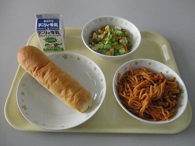 今日のメニューは、やきそば、ひじきとごぼうのサラダ、コッペパン、牛乳です。焼きそばをパンにはさみたくなりそうなメニューです。昨日栄養教諭の先生にお聞きしたのですが、和食は口内調味(口の中でご飯やおかずの味を調える)ことができるのだそうです。今度和食の時に意識してみようと思いました。