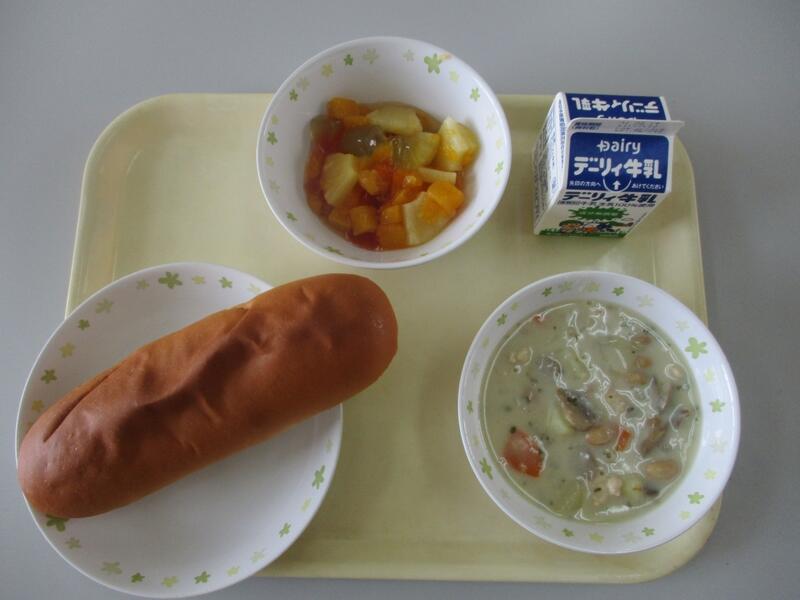 本日のメニューは、コッペパン、牛乳、パンプキンポタージュ、日向夏ドレッシングサラダでした。夏野菜のカボチャですが秋を感じさせる食材ですね。食欲の秋ですから、いっぱい食べて、大きく成長してもらいたいものです。