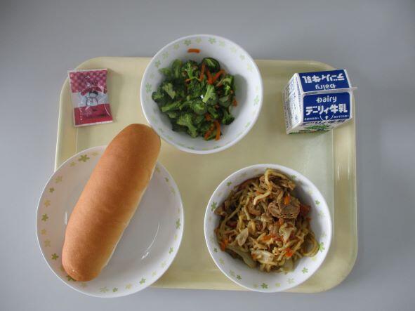 本日のメニューは、ご飯、牛乳、焼き肉炒め、サツマイモのみそ汁でした。