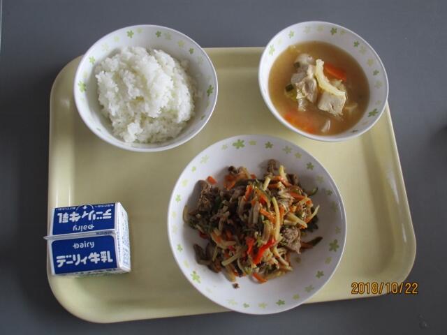 10/22の給食は、チンジャオロースとキムチ汁、白ご飯、牛乳です。