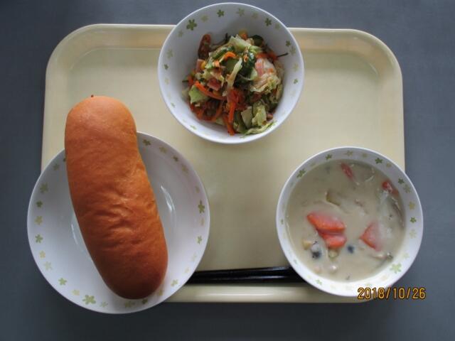 本日のメニューは、コッペパン、秋のシチュー、りっちゃんサラダです。