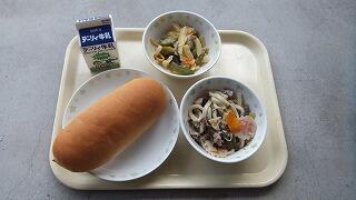 今日のメニューはポークビーンズといもいもサラダです。パンは黒糖パンです。今日は全校体育で集団行動の練習をしましたが、全員花丸でした。きっとおなかもぺこぺこでしょう。