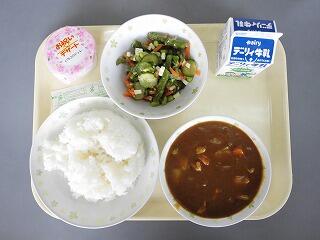 今日の給食は、子ども達の大好きなカレーに青豆とチーズのサラダ、それからお祝いイチゴのジュレがデザートで付きました。1年生は、初めての給食のカレーにとても喜んでいました。