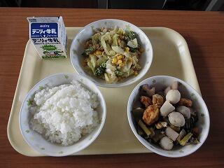 今日のメニューは、春野菜の煮物、春キャベツの梅和え、白ご飯、牛乳でした。少しずつ暑さを感じるようになってきました。野菜をしっかり取って、体調を整えましょう。