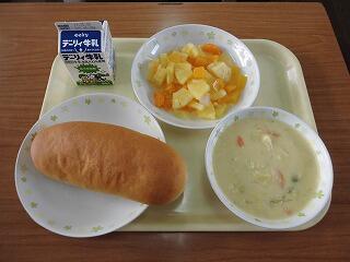 今日のメニューは、春キャベツのクリーム煮、フルーツカクテル、コッペパン、牛乳でした。