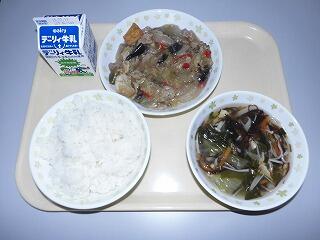 今日のメニューは、なすと豚肉の味噌炒め、もずくスープ、白ご飯、牛乳です。