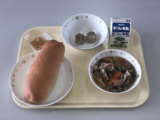 本日のメニューは、ポークシュウマイ(2個)、八宝菜、コッペパン、リンゴジャム、牛乳でした。