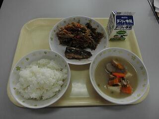 今日のメニューは、いわしのおかか煮、きんぴらごうぼう、厚揚げのみそ汁、白ご飯、牛乳です。