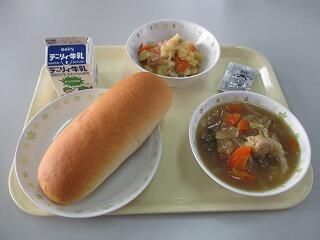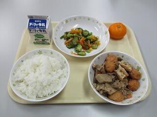 今日のメニューは、鶏肉とさつまいものあげ煮、野菜スープ、黒糖パンです。鶏肉とさつまいもがよく合っています。今週もおいしい給食でした。今週は寒さ厳しく体調をくずす子どももやや目立ちましたので、体を冷やさないよう、気をつけてください。