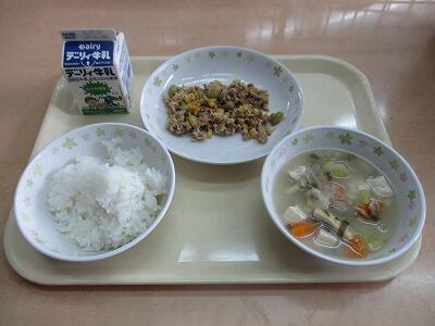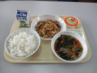 今日のメニューは、高菜そぼろ丼、具だくさんみそ汁、白ご飯、牛乳です。4連休明けですが子どもたちは全体的に元気です。下校時刻が13時20分から13時30分頃となりますので、帰宅後の過ごし方につきましてのご指導よろしくお願いいたします。