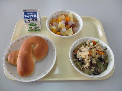 今日のメニューは、やきそば、ひじきとごぼうのサラダ、コッペパン、牛乳です。焼きそばをパンにはさみたくなりそうなメニューです。昨日栄養教諭の先生にお聞きしたのですが、和食は口内調味(口の中でご飯やおかずの味を調える)ことができるのだそうです。今度和食の時に意識してみようと思いました。