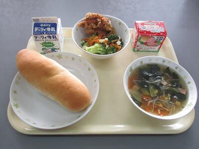 今日のメニューは、フライドチキン、星のチーズサラダ、コンソメスープ、減量コッペパン、クリスマスケーキ、牛乳です。