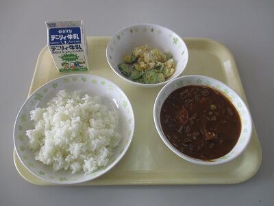 今日のメニューは、ハヤシライス、ツナイモサラダ、白ご飯、牛乳です。
