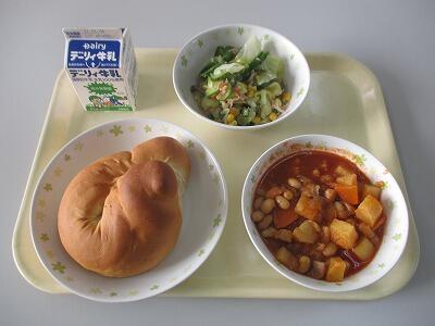 今日のメニューは、チキンと豆のトマト煮、さわやかサラダ、黒糖パン、牛乳です。