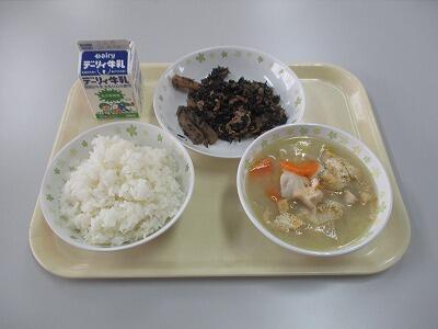 今日のメニューは、みやざきじどっこの煮しめ、ほうれん草のアーモンド和え、白ご飯、牛乳です。郷土料理の日(宮崎県)です。歯ごたえのあるじどっこを楽しませていただきたいと思います。