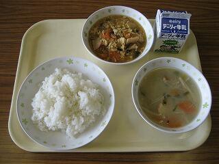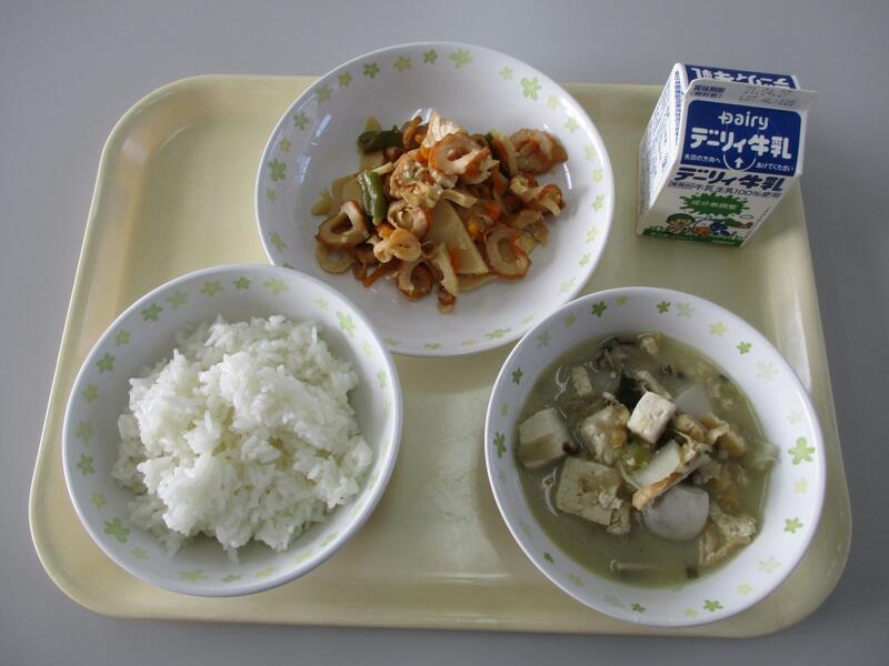 今日の給食は、ご飯、たけのこの辛み炒め、さつま汁、牛乳でした。主菜には、春の味覚のたけのこがたっぷり使われていました。春を感じながら美味しくいただきました。