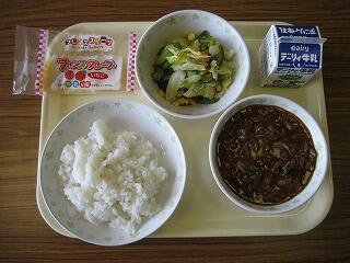 春野菜のサラダは春の食材がいっぱいで春を感じさせてくれます。何より、子どもたちが大好きなハヤシライスとイチゴクレープが出ましたので、子どもたちは今日の給食に大満足だったことでしょう。