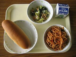 本日のメニューは、チーズパン、牛乳、ナポリタンスパゲティ、キャベツのツナ和えでした。