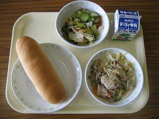 本日のメニューは、減量コッペパン、牛乳、チャンポン、キャベツの塩昆布和えでした。