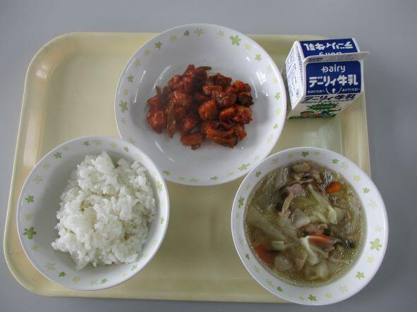 今日の給食は、ご飯、宮崎県産かんぱちのチリソース和え、ワンタンスープ、牛乳でした。かんぱちのチリソース和えは珍しい献立でしたが、とてもおいしくいただきました。