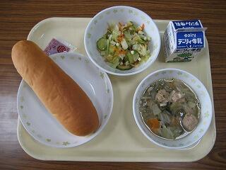 本日のメニューは、コッペパン、牛乳、肉団子スープ、チーズサラダ、いちごミックスジャムでした。
