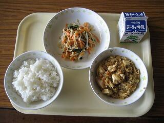 本日のメニューは、ご飯、牛乳、マーボー豆腐、ほうれん草のナムルでした。ナムルは朝鮮半島の家庭料理の一つで、もやしやほうれん草を調味料とゴマ油で和えたものです。さっぱりとしておいしかったですよ。