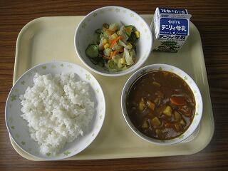 本日のメニューは、ご飯、牛乳、チキンカレー、コールスローサラダでした。