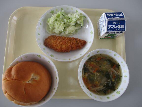 今日の給食は、バーガーパン、白身魚フライ、ゆでキャベツ、コーンスープでした。子どもたちは、パンに魚フライとキャベツをはさんでフィッシュバーガーを作り、大きく口を開けて頬張っていました。
