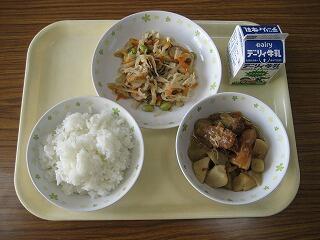 本日のメニューは、ご飯、牛乳、都城なん骨味噌煮、切干し大根炒めでした。今日は、郷土料理のメニューでした。都城なん骨味噌煮のお肉は、箸で切れるほど柔らかくとてもおいしかったですよ。