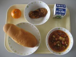 本日のメニューは、コッペパン、牛乳、宮崎県産シイラフライ、ミネストローネ、ミカンでした。