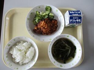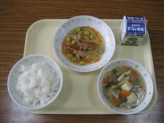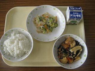 本日のメニューは、ご飯、牛乳、厚揚げの中華煮、春雨サラダでした。