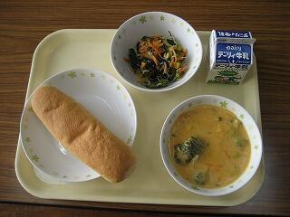 本日のメニューは、米粉パン、牛乳、にんじんポタージュ、ちりめんサラダでした。