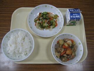 本日のメニューは、ご飯、牛乳、がめ煮、白菜の塩昆布和えでした。