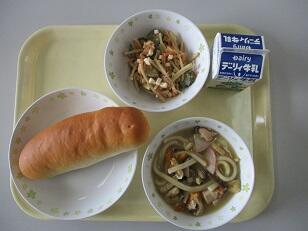 今日の給食は、減量ミルクパン、五目うどん、ごぼうのサラダ、牛乳でした。ごぼうは食物繊維が豊富でお腹の中をきれいに掃除してくれる働きがあります。今日のサラダには宮崎県産のごぼうが使われていました。