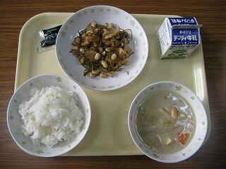 本日のメニューは、ご飯、牛乳、鉄ひじきのり、豆乳みそ汁、きざみ昆布と大豆の煮物でした。
