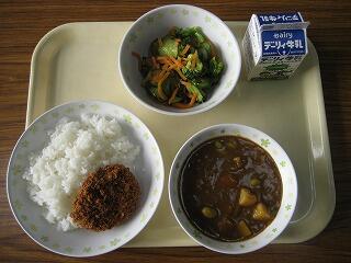 本日のメニューは、ご飯、牛乳、野菜カレーとヒレカツのカツカレー、グリーンサラダでした。
