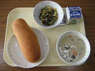 本日のメニューは、コッペパン、牛乳、黒豆きなこクリーム、クラムチャウダー、小松菜のソテーでした。