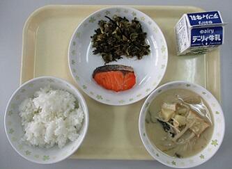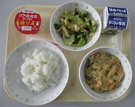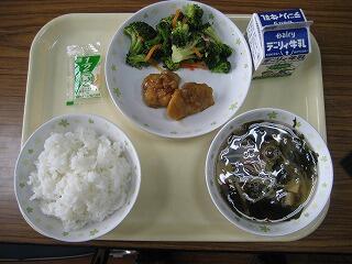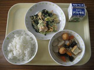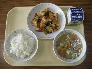 本日のメニューは、ご飯、牛乳、厚揚げの中華煮、さつま汁でした。