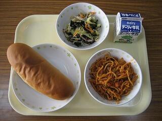 本日のメニューは、黒糖パン、牛乳、ナポリタンスパゲティ、海藻サラダでした。