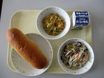 今日の給食は、チーズパン、あんかけビーフン、野菜のガーリックソテー、牛乳でした。あんかけビーフンには、白菜がたっぷり入っていました。白菜は今が旬の野菜です。甘みが増していてとても美味しかったです。