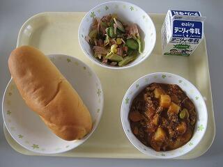 今日は「ベジ活の日」ということで、野菜いっぱいのメニューでした。牛肉のトマト煮はお肉もいっぱい入っていて、子どもたちがおいしそうに食べていました。