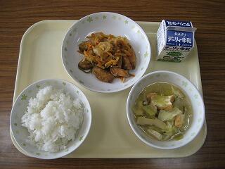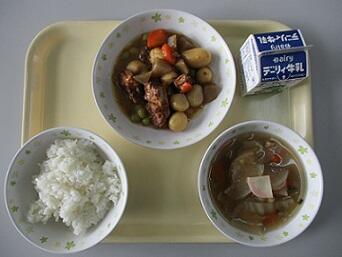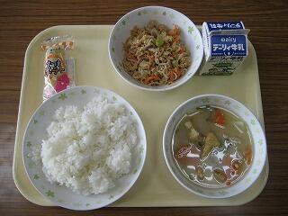 今日の給食は、ご飯、都城軟骨みそ煮、かねんしゅい、牛乳でした。軟骨みそ煮とかねんしゅいは都城の郷土料理です。都城でできた物を使い、伝統的な調理法で作られた地域性豊かな郷土料理、とても美味しかったです。