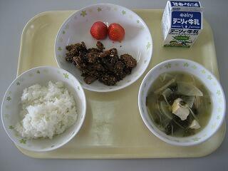 本日のメニューは、ご飯、牛乳、宮崎県産のいわしのかば焼き、大根葉のみそ汁、イチゴでした。