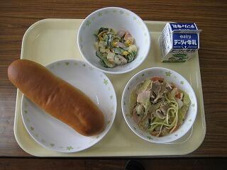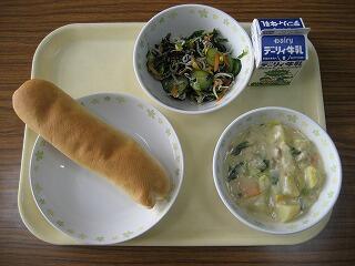 本日のメニューは、米粉パン、牛乳、冬野菜のクリーム煮、ちりめんサラダでした。