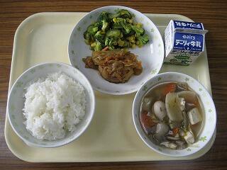 本日のメニューは、ご飯、牛乳、県産肉のハンバーグオニオンソースがけ、ブロッコリーのサラダ、けんちん汁でした。