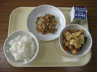本日のメニューは、ご飯、牛乳、お魚丼の具、具だくさんみそ汁、さつまポテトでした。