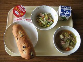 本日のメニューは、レーズンパン、牛乳、ポトフ、アスパラガスのサラダ、ヨーグルトでした。