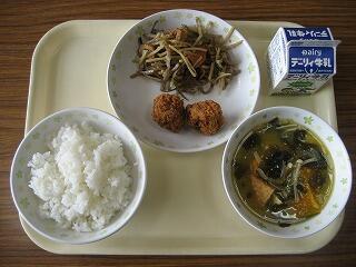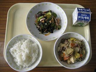 本日のメニューは、ご飯、牛乳、ニラミンチ、茎わかめのキンピラ、カボチャのみそ汁でした。